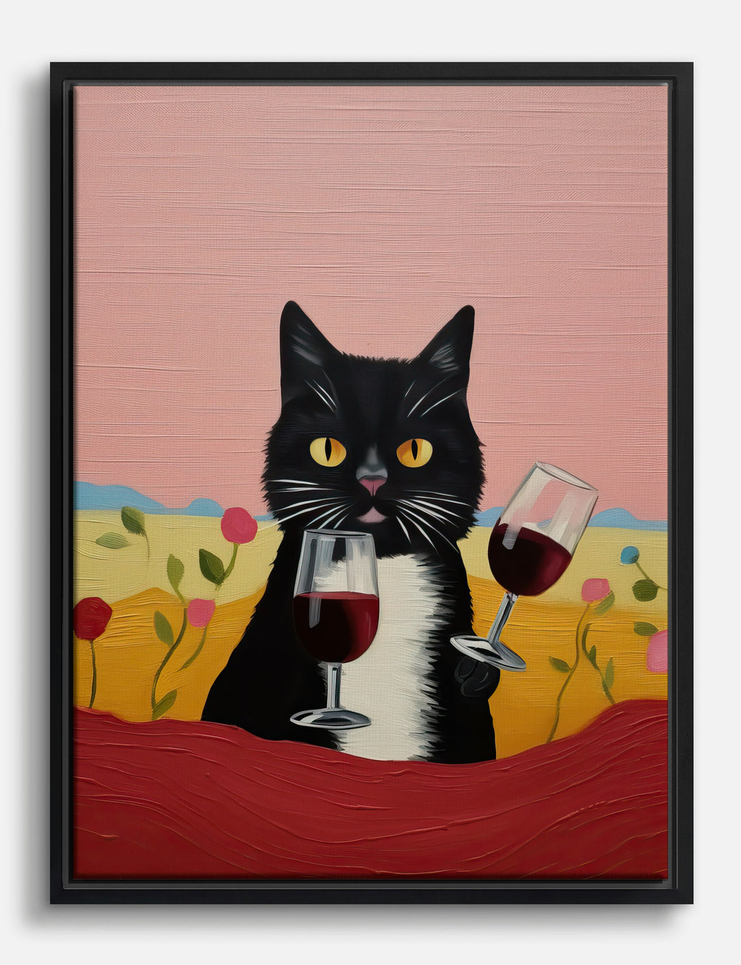 Ever wished your decor could bring a smile and a spark of personality to your space? This playful tuxedo cat, double-fisting glasses of red wine against a dreamy floral backdrop, is ready to be the life of your room. The bold pinks and sunny yellows pop with both modern charm and a dash of humor, instantly brightening up your living room or kitchen.