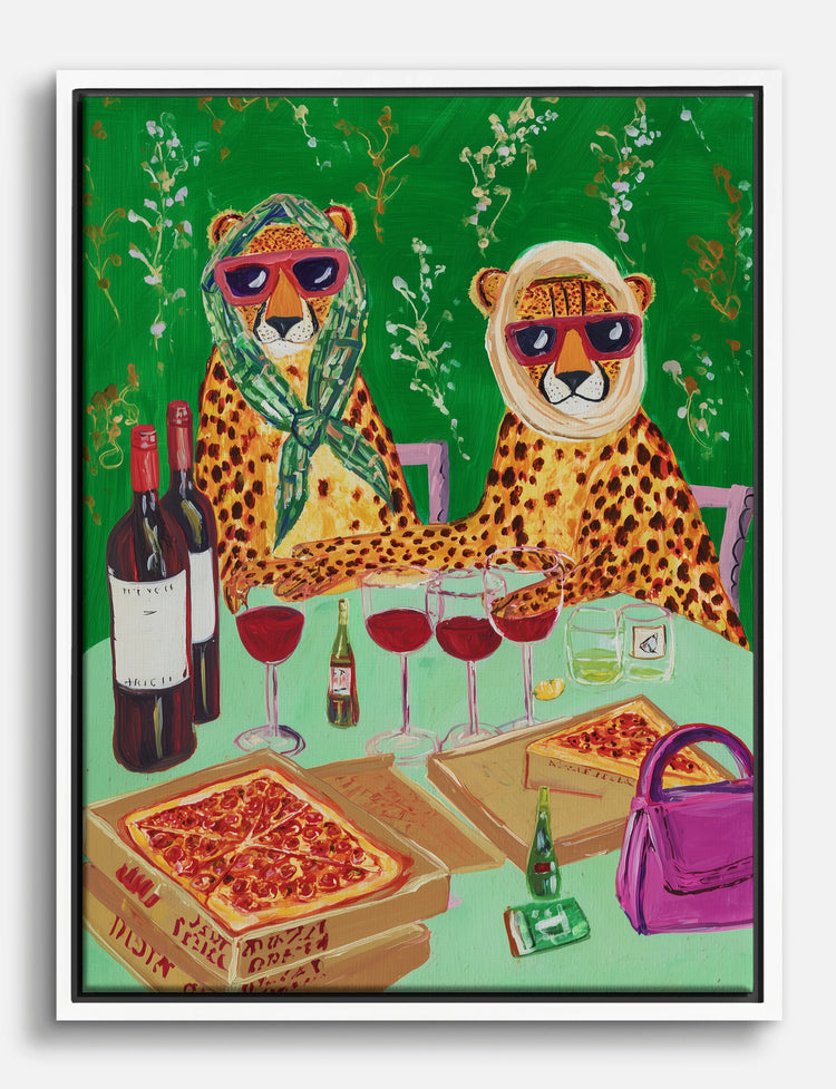 Two cheetahs, headscarves tied and sunglasses on, hold court at the ultimate pizza soirée—this is playful sophistication at its best. Let your space radiate with the kind of confidence that comes from mixing fierce style with a dash of humor.