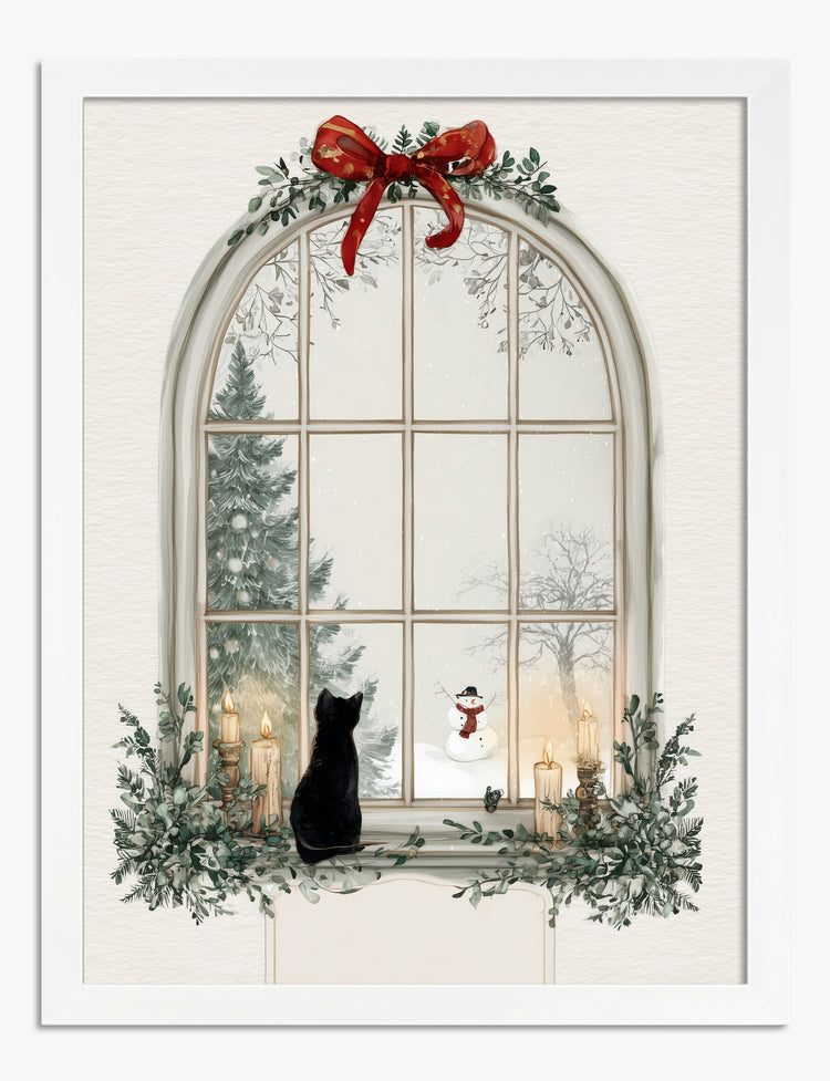 Ever crave that first-snow hush at home? This charming piece bottles it up: a curious cat perched at an arched window, candles glowing on the sill, evergreen sprigs, and a bright red bow framing a quiet snowman outside.