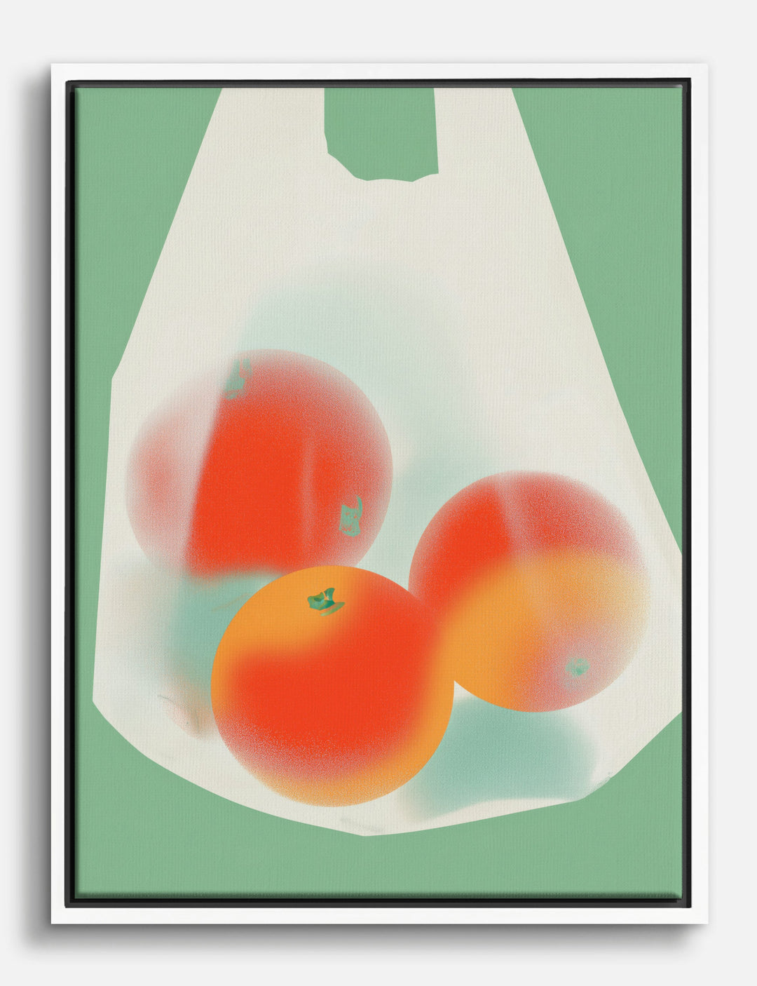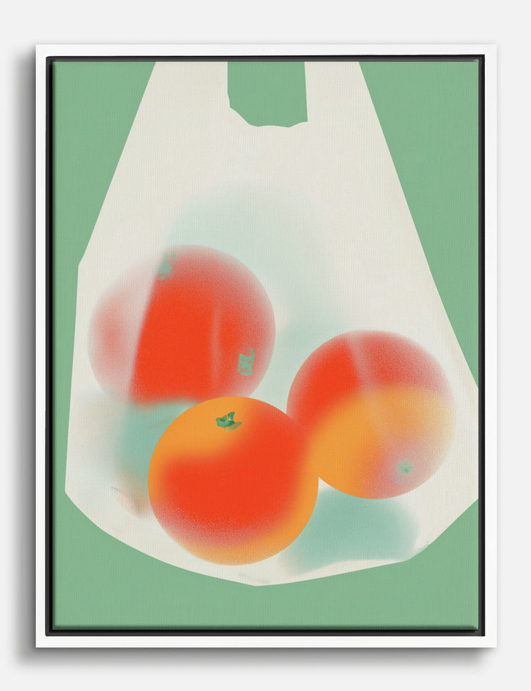 Bring a fresh pop of color into your space with the playful simplicity of three radiant oranges nestled in a translucent bag. This piece captures the everyday magic of a grocery run—reminding you that style is about celebrating the little moments that make life bright.