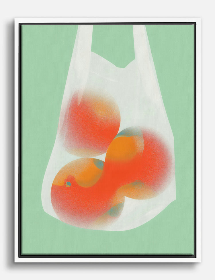 Fresh, unexpected, and undeniably charming—this piece brings a playful twist to everyday simplicity. Bright oranges peek out from a translucent bag, their vibrant colors popping against a soft, minty background. Its a subtle nod to life’s little joys, like grabbing fresh fruit on a sunny morning.