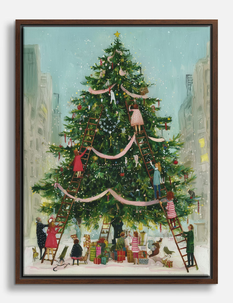 What if your home could capture the wonder and warmth of a city coming together for the holidays? This joyful piece is pure festive spirit—children and families gather to decorate a grand Christmas tree, sparkling with ornaments and possibility.