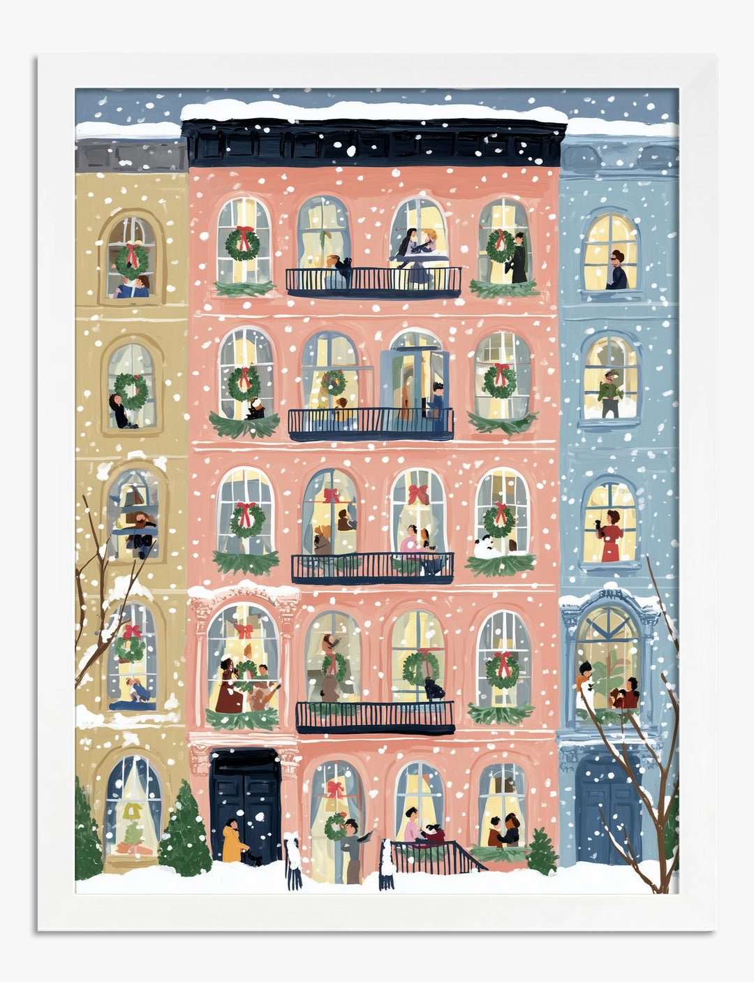 Step into a snow-dusted city evening, where every window glows with warmth and holiday cheer. This charming piece brings the magic of festive gatherings and cozy moments right into your home, inviting you to savor the spirit of connection—even on the chilliest nights. Imagine it brightening your living room or entryway, setting the tone for joyful celebrations and everyday comfort. The soft blues, rosy pinks, and golden yellows make it effortlessly blend with modern, vintage, or eclectic decor, adding a pop of personality wherever it hangs. Let your walls tell a story of togetherness and celebration. With this art print, you’ll create a space that feels inviting, stylish, and uniquely yours—no renovation required.