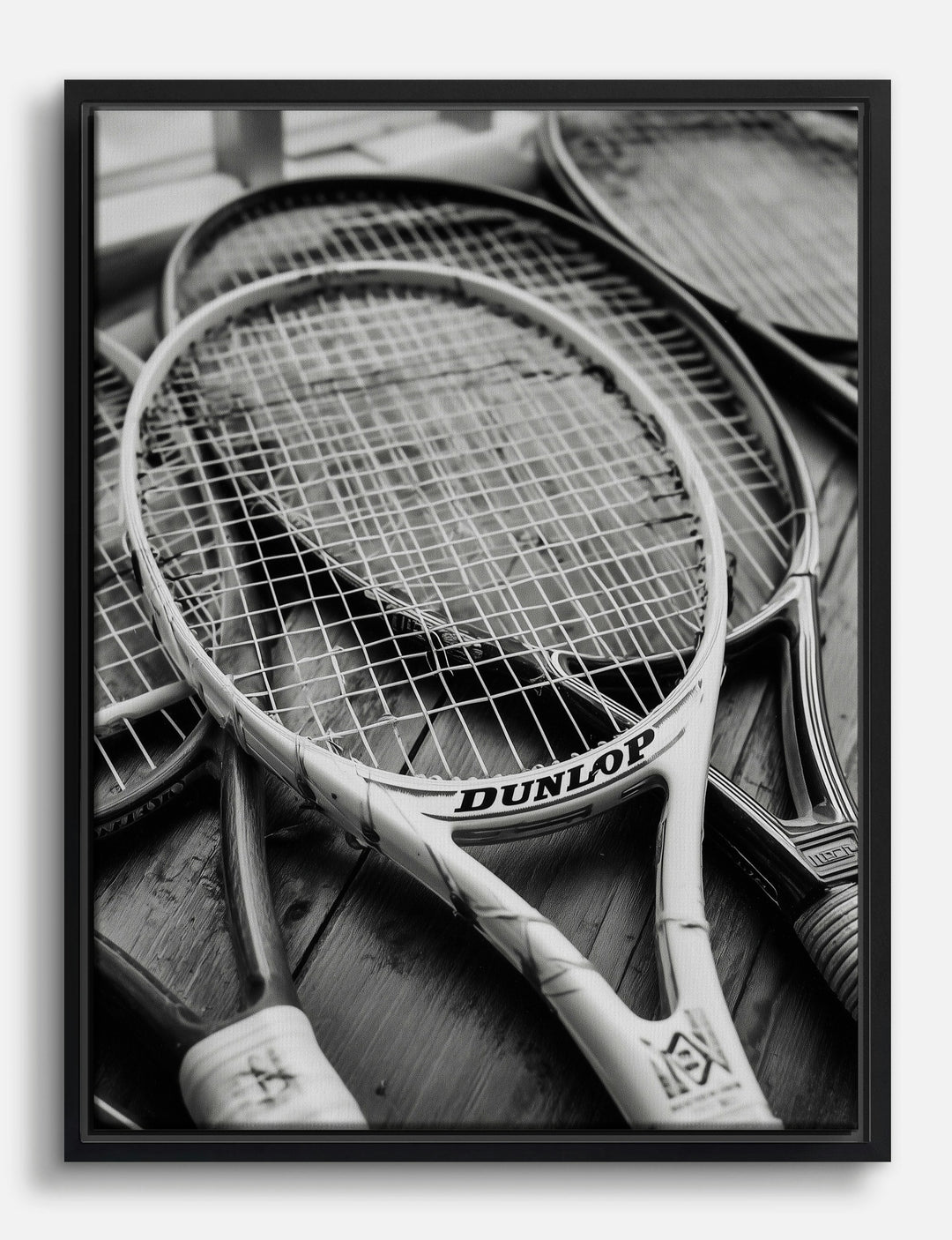 There’s something timeless about the texture and tangle of well-loved tennis rackets, captured here in striking black and white. This piece brings a quiet energy to your space—think of it as a nod to vintage sport and effortless style, all in one glance.