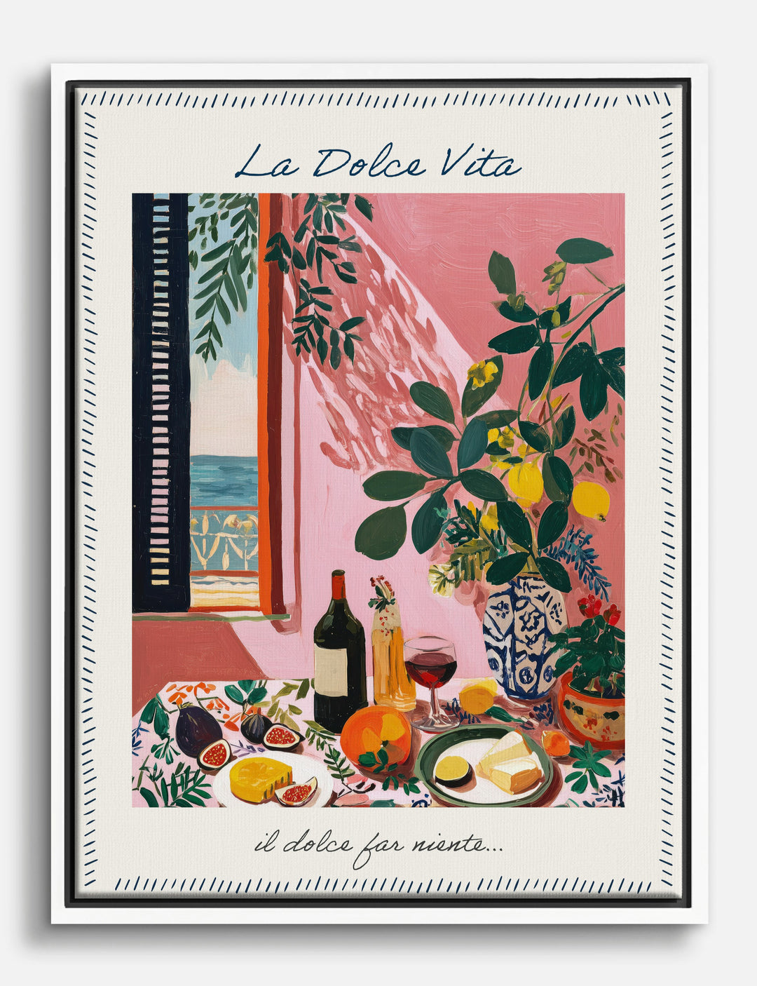 Step into a sun-drenched afternoon on the Mediterranean coast — right from your own home. A vibrant table brimming with figs, citrus, wine, and artful ceramics brings a taste of la dolce vita to your everyday.