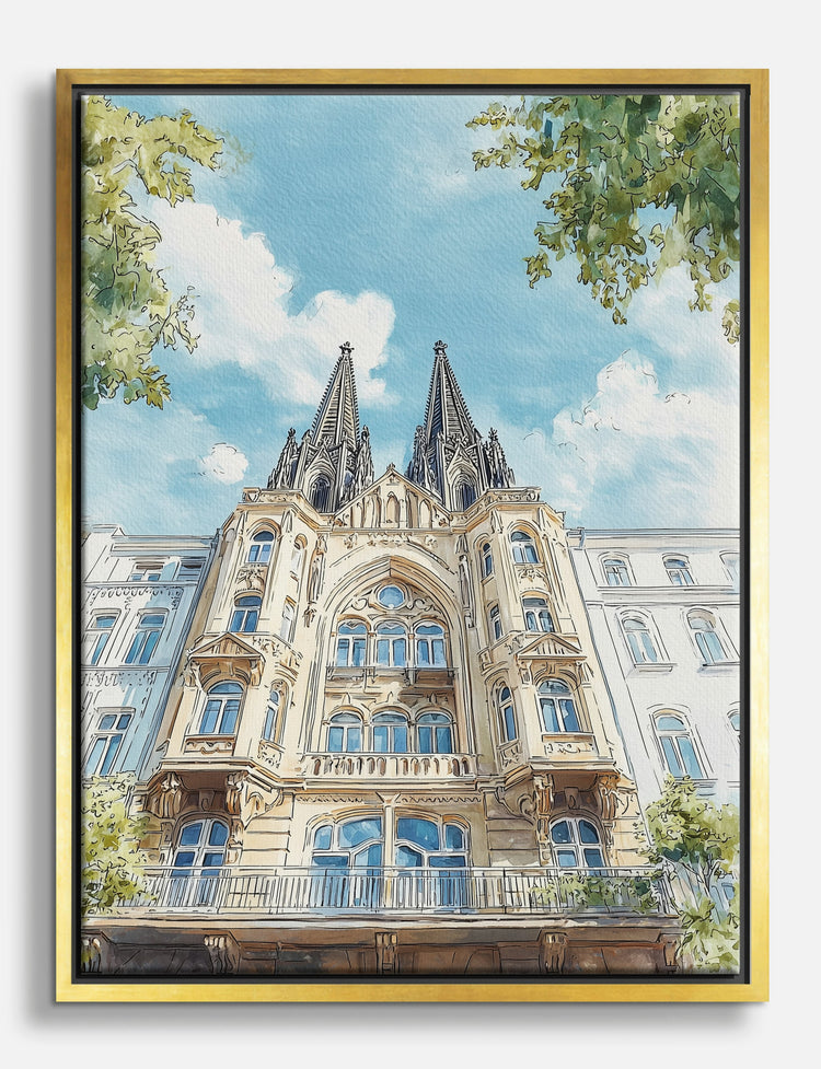 Ever noticed how a single view can transport you somewhere new? This watercolor captures the soaring spires and ornate charm of Cologne’s architecture, inviting a sense of wonder right into your home. The soft blue sky and warm golden façade instantly brighten your space, making every day feel a bit more adventurous.