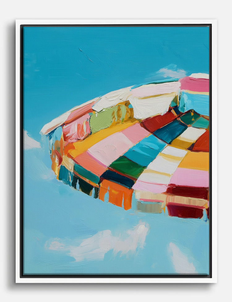 A burst of color floats above you, like the perfect summer day captured on canvas. This playful umbrella, painted in bold stripes and sun-washed hues, instantly lifts the mood of any room. Hang it in your living room or bedroom and watch as your space gets an effortless upgrade—no beach required.