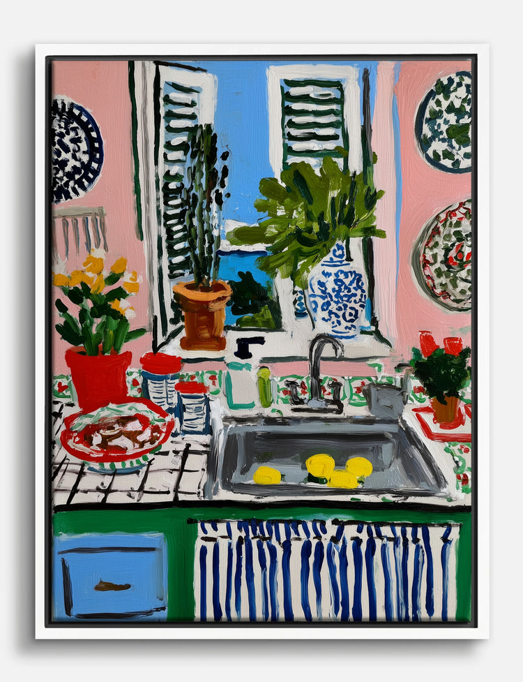 Sunshine spills across your space with this vibrant kitchen scene inspired by Matisse. Pops of lemon yellow, bold blue stripes, and lush greenery instantly energize any wall—no renovation required.