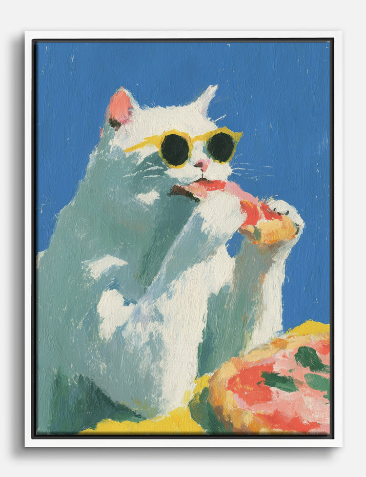 Who says your walls can’t have a sense of humor? This playful print brings instant personality — a stylish cat rocking yellow shades, savoring a slice of pizza under a brilliant blue sky. It’s pure, unapologetic fun for your space.