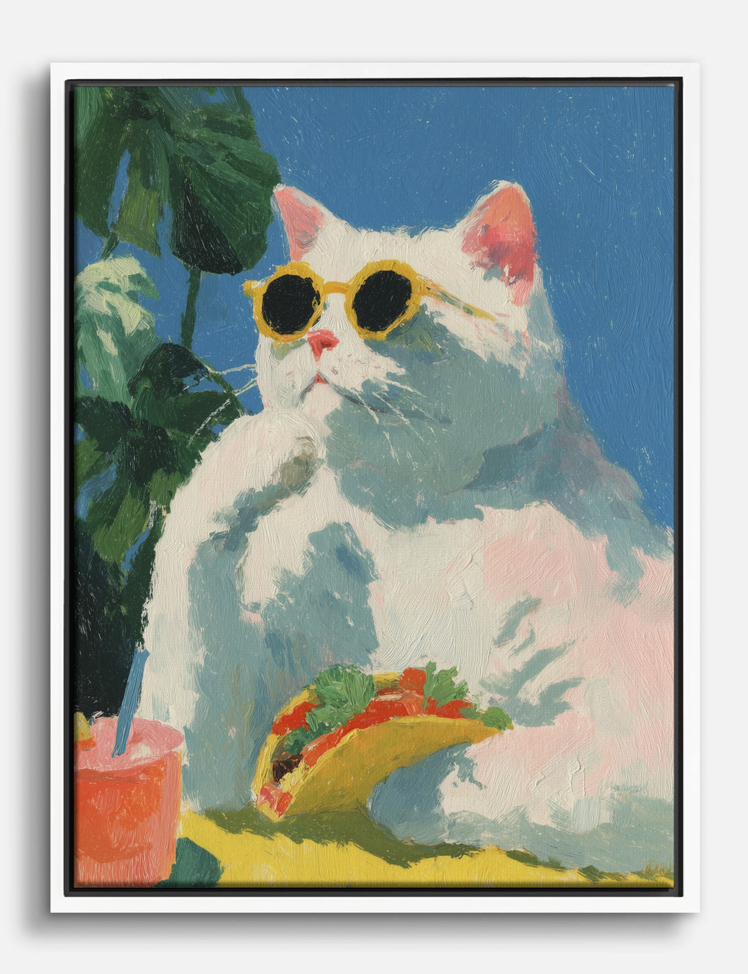 A white cat in sunglasses, taco in paw — could your walls get any more fun? This playful piece radiates pure personality, instantly lifting the mood in any room. It’s the kind of art that sparks smiles, invites conversation, and lets your style shine through.