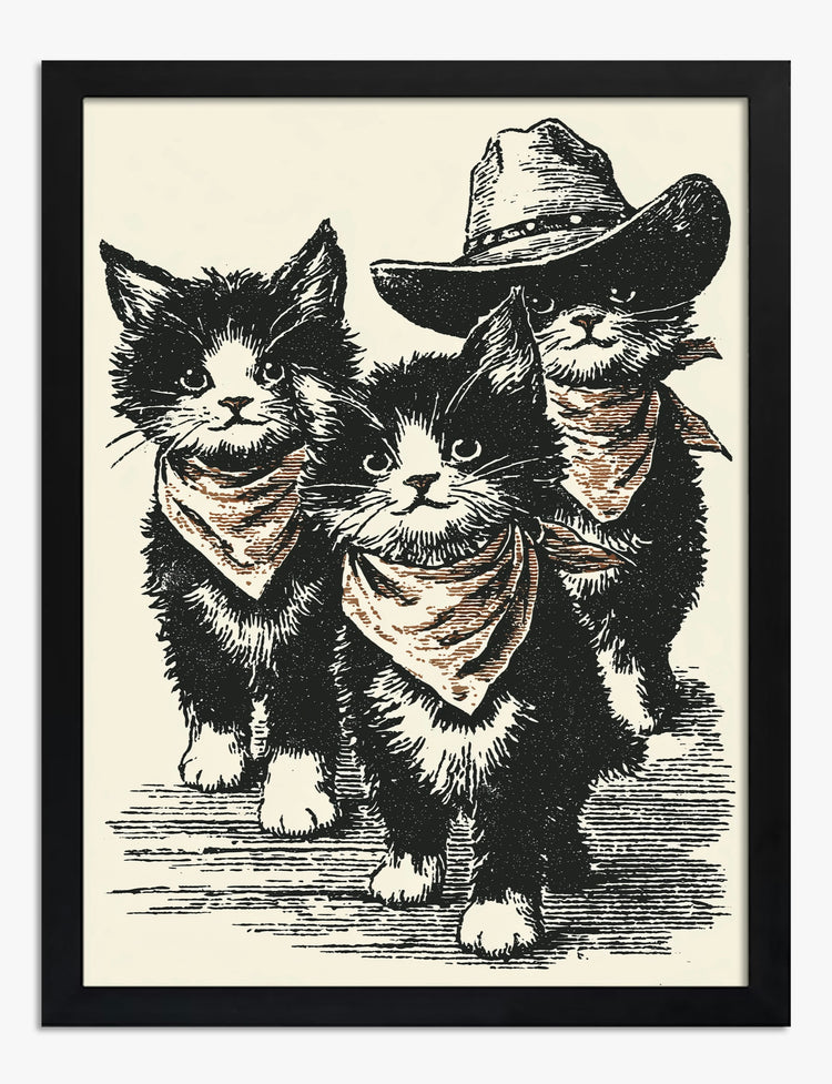 Three kittens, three bandanas, one irresistible dose of charm. This playful piece captures a posse of adventurous felines, complete with a cowboy hat and plenty of attitude. It’s a wink and a grin for your walls—perfect for anyone who loves a little personality in their space.