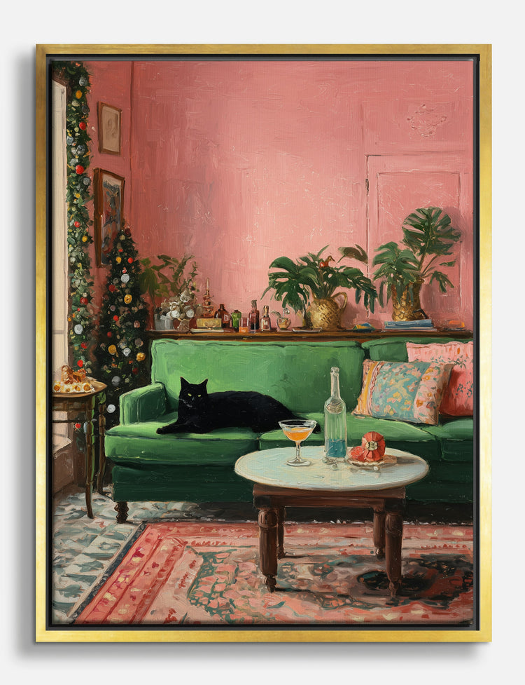 Step into a world where style meets comfort and every detail feels curated just for you. This vibrant scene instantly sets a welcoming, festive mood—lush plants, a sparkling Christmas tree, and a sleek black cat lounging on a plush green sofa. Pops of pink and green energize your space, while vintage-inspired accents add a touch of nostalgia.