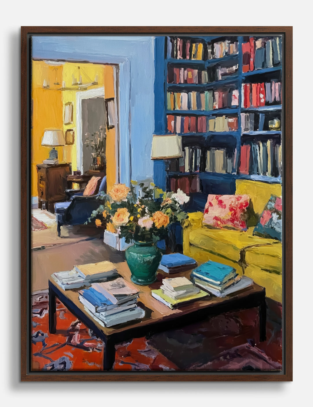 Step into a world where color and comfort collide. This vibrant scene instantly infuses your space with warmth and personality—think sunlit yellows, lush florals, and shelves brimming with stories.