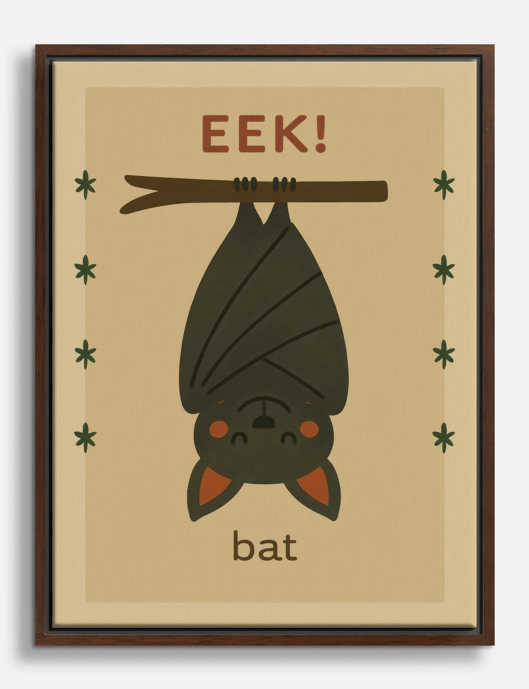 Add a touch of whimsy to your nursery with this delightful upside-down bat illustration. With its playful expression and rich, earthy tones, it’s a charming way to inspire smiles and creativity. Perfect for creating a cozy and imaginative space, this piece effortlessly complements a variety of decor styles, making it a unique and affordable addition to your home.