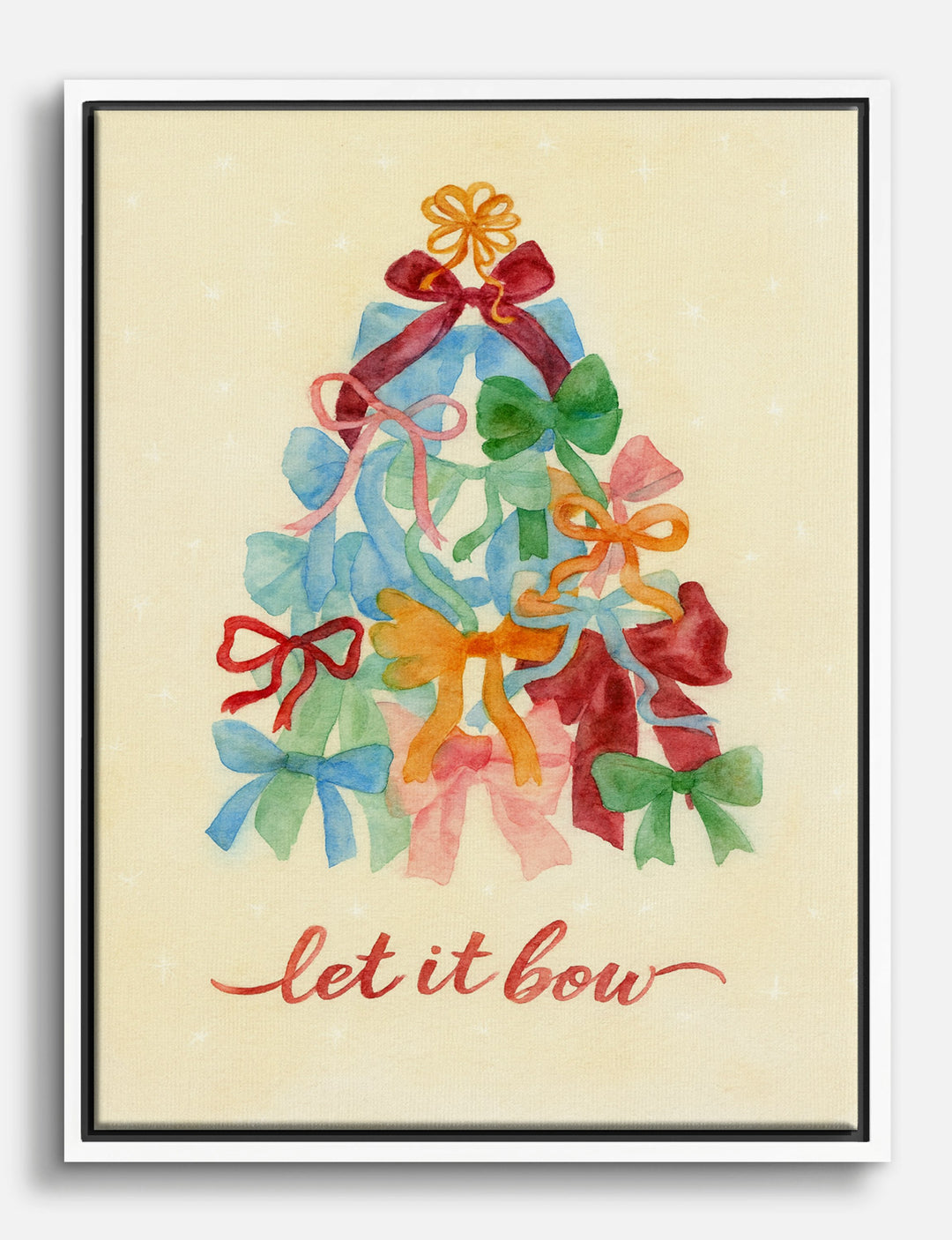 Who says holiday spirit can’t be stylish? This playful print turns a simple arrangement of colorful bows into a whimsical Christmas tree, topped with a golden flourish and wrapped in cheer.