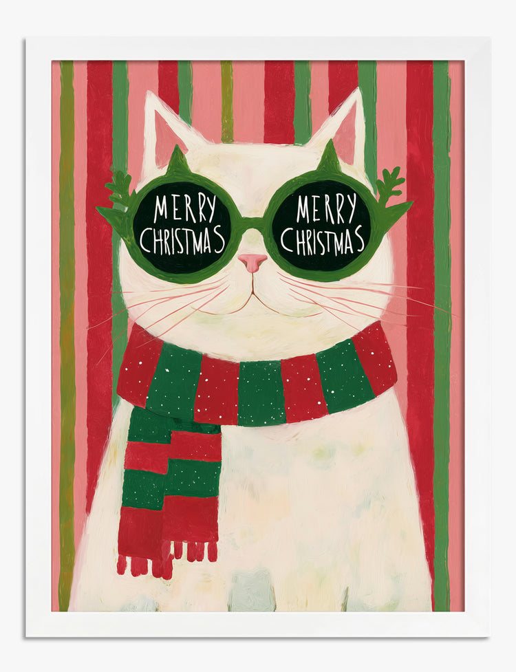 Who says your walls can’t join the holiday fun? This playful white cat, decked out in green-and-red stripes and oversized “Merry Christmas” shades, brings instant cheer to any space. The bold, whimsical design pops with festive energy, making it impossible not to smile every time you walk by.