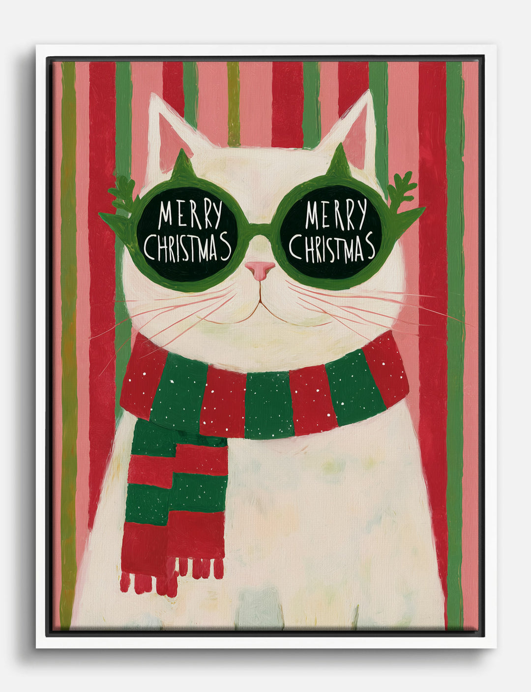 Bold, playful, and full of holiday spirit—this charming cat is ready to take center stage in your home. With its oversized “Merry Christmas” sunglasses and cozy red-and-green striped scarf, it’s impossible not to smile every time you walk by.