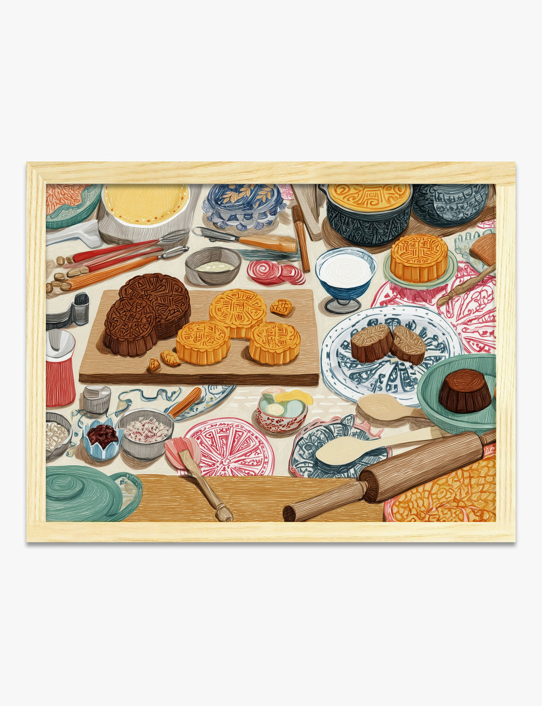 Bursting with color and warmth, this piece instantly transports you to a lively kitchen where tradition and togetherness take center stage. Every detail—from the intricate mooncakes to the delicate porcelain bowls—invites you to savor the simple joys of home. Hang this in your dining room or kitchen to spark conversations and stir memories of shared meals and laughter. The inviting palette of golden yellows, soft blues, and natural wood tones plays well with both modern and vintage decor, adding a pop of personality without overwhelming your space. You’ll love how this artwork brings a sense of abundance and celebration to your everyday. It’s an easy way to make your home feel more welcoming, more you, and effortlessly stylish—no renovation required.