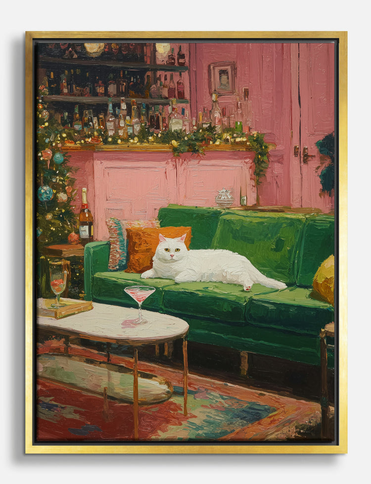 A plush green sofa, a poised white cat, and a hint of holiday sparkle—this piece instantly infuses your space with cozy, confident charm. Picture it above your living room couch or in a bedroom reading nook, where its playful spirit and lush color palette invite you to unwind in style.