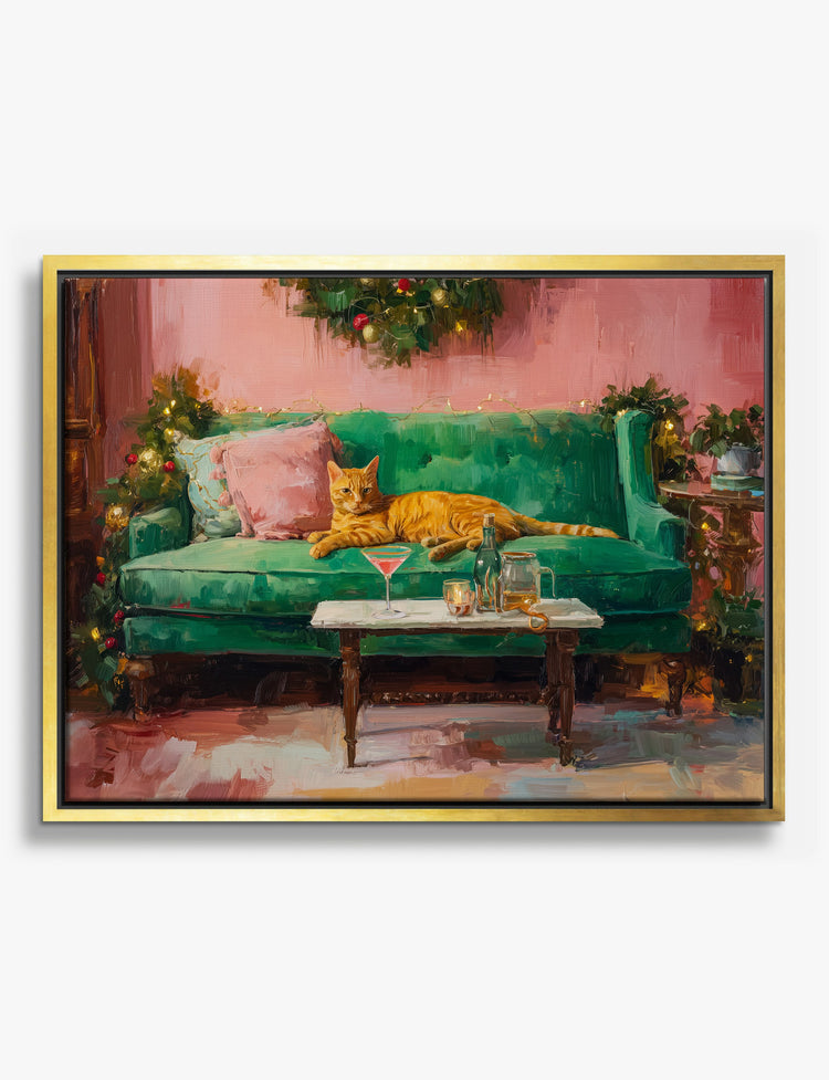 There’s nothing quite like the cozy glamour of a green velvet sofa — especially when it’s claimed by a ginger cat with holiday flair. This vibrant print instantly adds warmth and a hint of playful sophistication to your favorite room. Let the lush greens and soft pinks set a joyful, welcoming mood, perfect for living rooms, bedrooms, or any spot that could use a pop of festive spirit. The twinkle of garlands and the promise of cocktails invite you to unwind and celebrate everyday moments. Your space deserves art that feels inviting and unique — this piece is a conversation starter and a daily reminder to savor the good life. Go ahead, make your home feel as stylish and comfortable as you are.