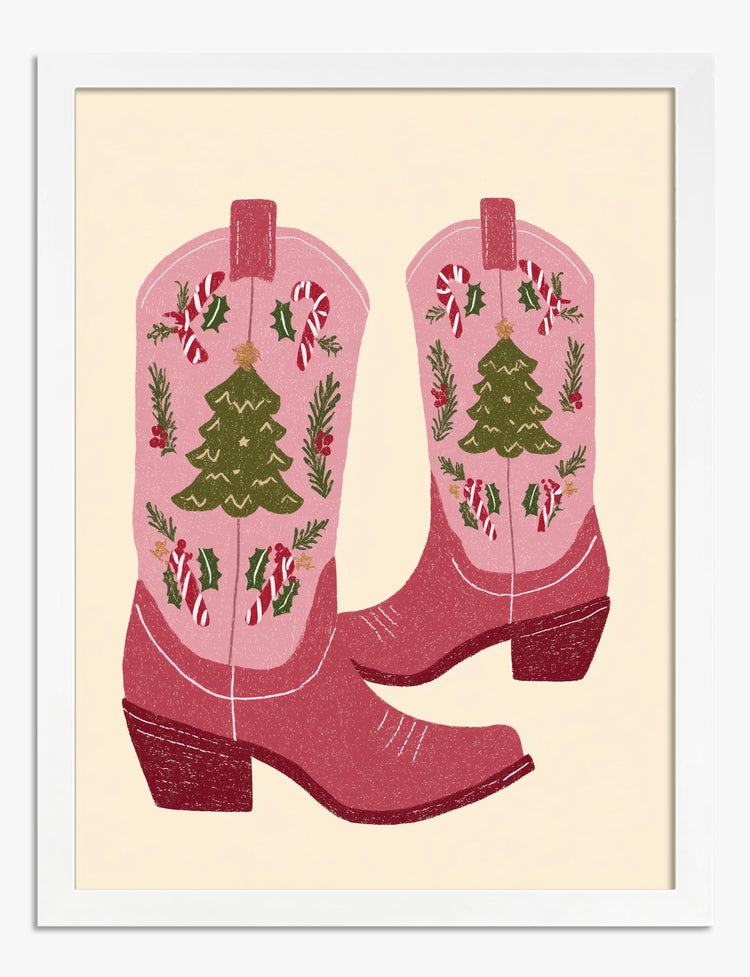 Kick up some holiday cheer with these delightfully bold pink cowboy boots, decked out in Christmas spirit. The playful blend of candy canes, holly, and a shining evergreen tree turns classic Western into pure festive fun.