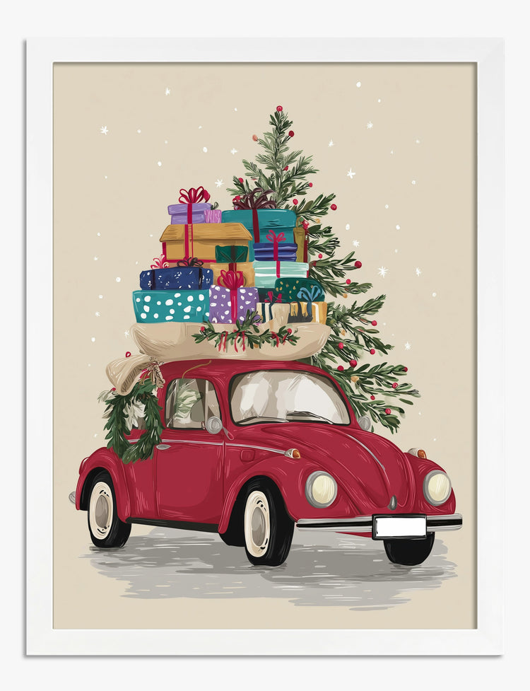 Holiday cheer gets a stylish upgrade with this playful scene: a classic red car stacked high with colorful gifts and a lush Christmas tree. It’s pure joy on wheels, ready to spark smiles the moment you walk into the room.