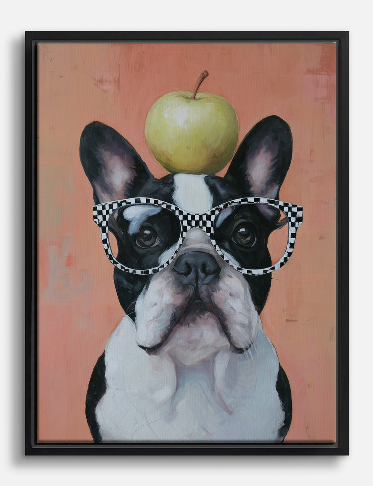 Meet your new favorite conversation starter. A playful French Bulldog, decked out in bold checkered glasses and topped with a crisp green apple, brings instant personality to any wall.