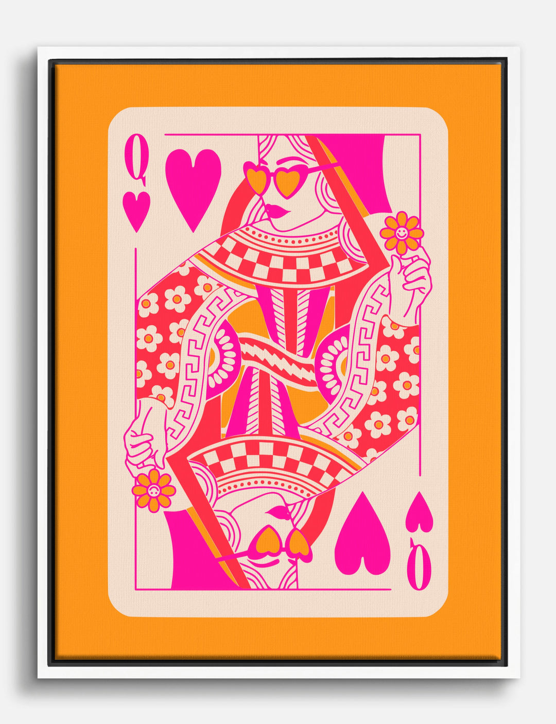 Step into a world of vibrant colors and playful charm with the Heart Queen Vibe. This art piece bursts with orange and pink, offering a modern twist on a classic design. Perfect for adding a pop of color to your living room or bedroom, it effortlessly complements various decor styles. Feel the joy and self-expression it brings to your space, making it a delightful conversation starter.