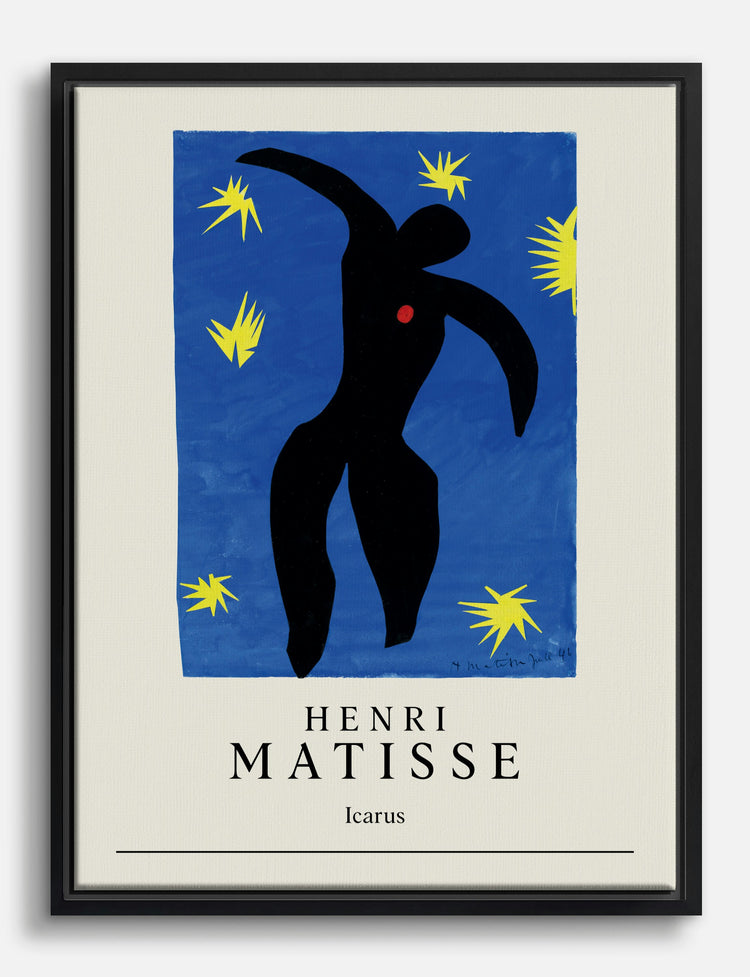 Bold, iconic, and utterly captivating—this Matisse instantly lifts your space with its energy. Black, fluid shapes leap across an electric blue sky, punctuated by bursts of radiant yellow and a single red heart. It’s a visual celebration of movement and possibility.