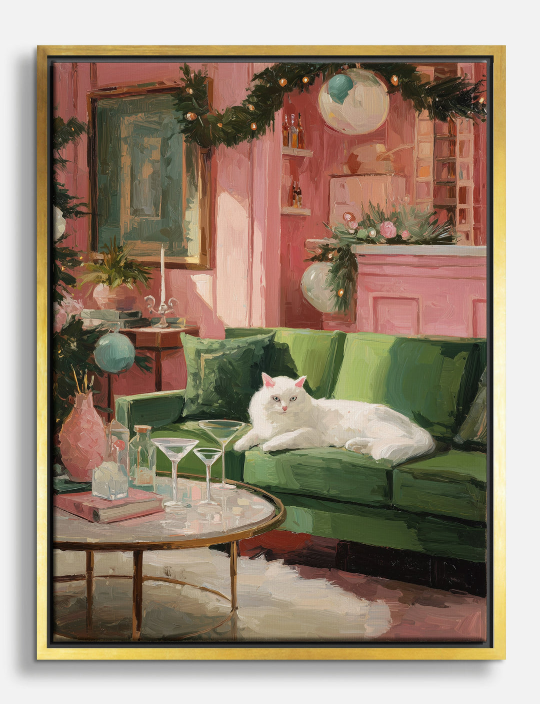 A plush green sofa, a regal white cat, and a swirl of festive charm—this piece instantly sets a scene you’ll want to step into. The lush pink walls and sparkling garlands make every day feel like a celebration, while that serene feline brings a sense of calm to the party.