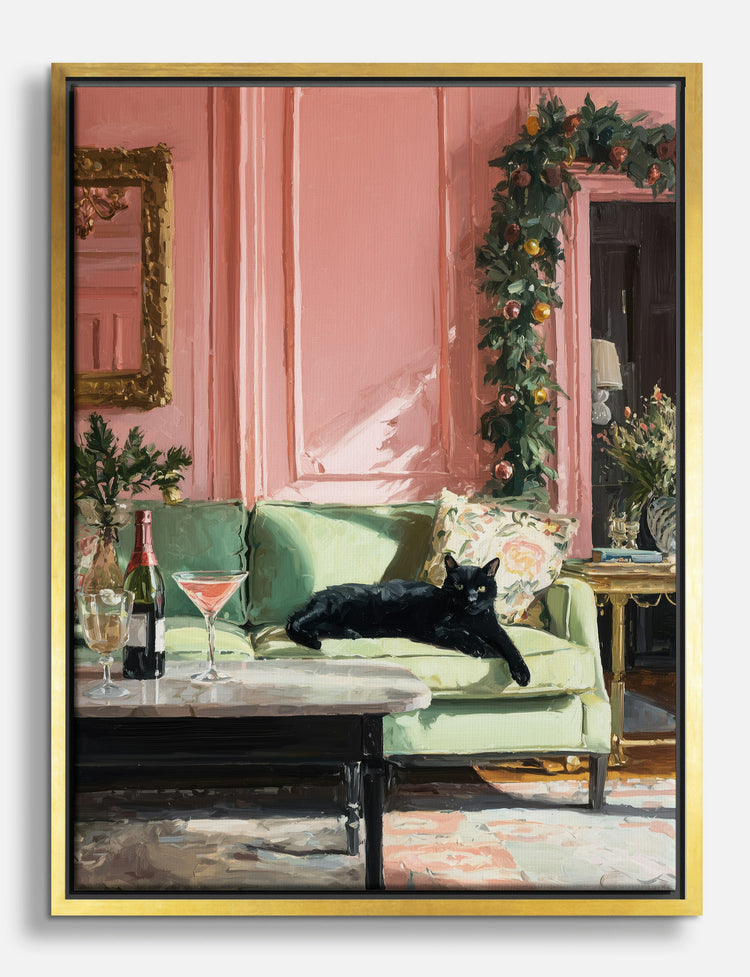 Step into a scene that’s equal parts cozy and chic. A sleek black cat lounges like royalty on a soft green sofa, set against playful pink walls and festive winter greenery. This artwork brings a dash of holiday spirit—with a twist of sophistication—right into your everyday.