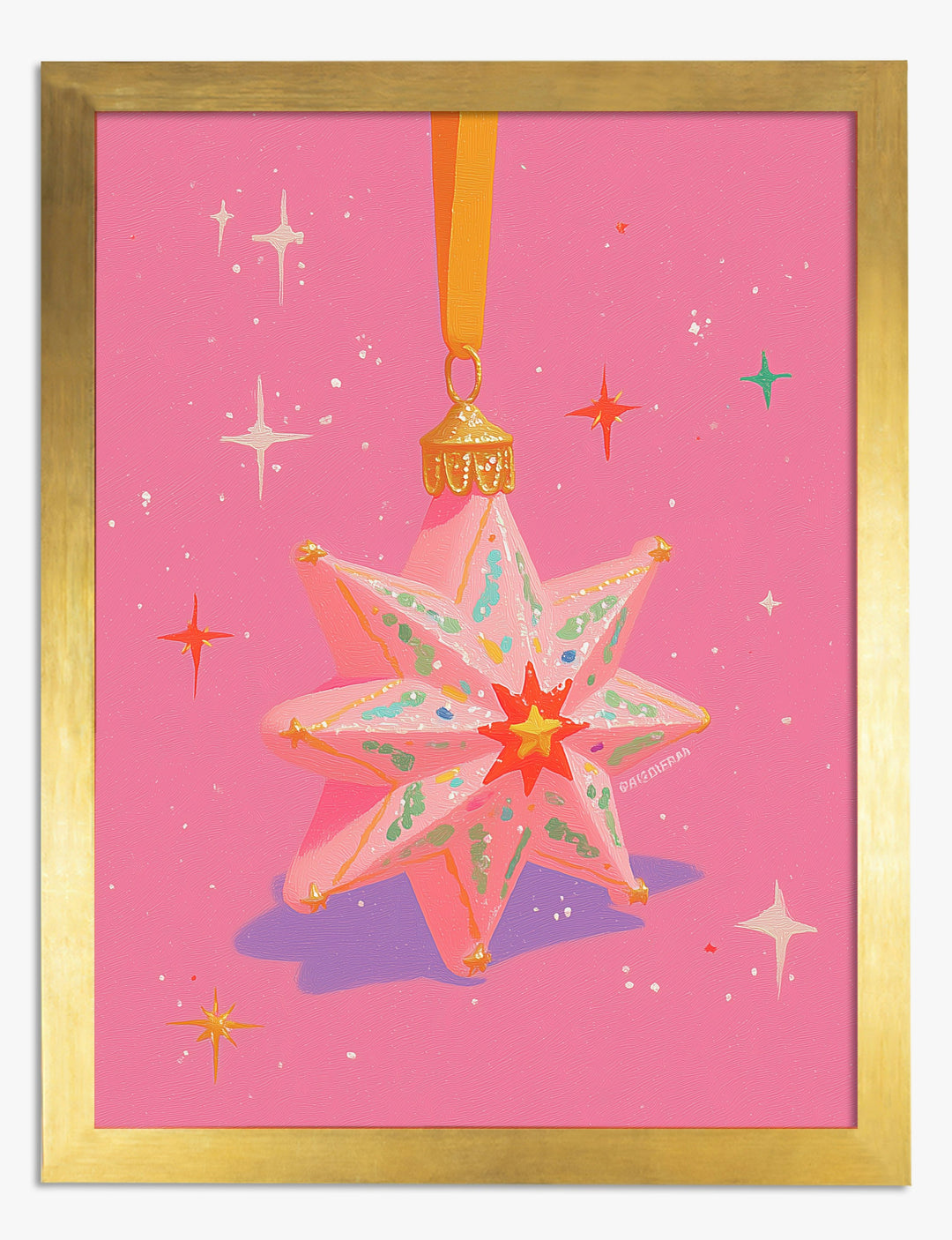 This little star brings big cheer. A radiant eight-pointed ornament floats on a playful pink sky, sprinkled with tiny sparks of mint, coral, and gold. It’s the kind of glow that makes a room feel instantly more joyful—no ladder, no lights, no fuss. Hang this in your living room or entryway and watch the mood brighten the second you walk in. The upbeat palette pops against neutral walls and sings beside warm woods, brass accents, or your favorite mid-century pieces. It’s festive for the holidays, but its happy energy works beautifully all year. You’ll love how it adds personality without overpowering your space—just the right dash of sparkle and color. Consider it your easy upgrade: small effort, big style payoff. Pair it with a gold frame to echo the ornament’s cap and ribbon, or let it be the star of a gallery wall for a confident, curated look you’ll be proud to show off.