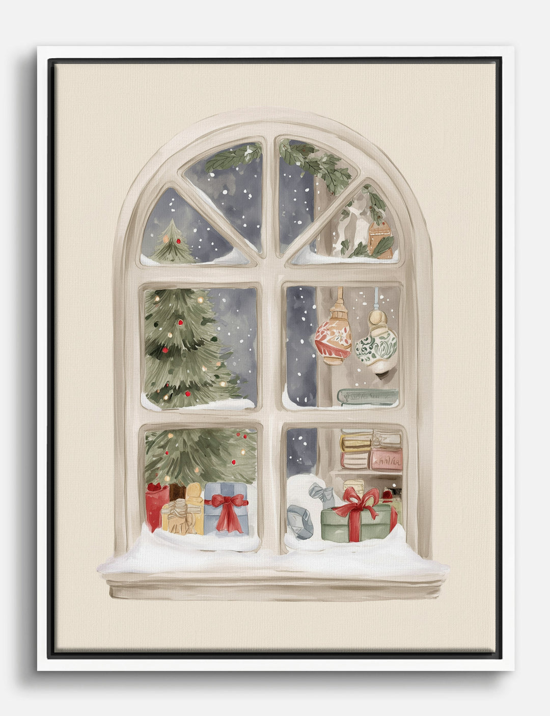 Through a frosty pane, a quiet winter evening glows—twinkling tree, layered gifts, and drifting snow. This soft watercolor wraps your space in that just-lit, first-snow feeling, inviting calm and cozy nostalgia. The palette of creamy beige, evergreen, powdery blue, and ribbon red plays beautifully with neutral sofas, Scandinavian woods, and plush throws. Hang it in the living room or by the entryway to greet guests with instant cheer. It’s an easy way to bring the holidays home—no ladder, no tangled lights. Just a charming window vignette that makes your walls feel warm, thoughtful, and wonderfully yours. Affordable, unique, and ready to mix with what you already have, this piece gives your home that collected look you love. For a crisp, snowy finish, choose a white frame and let the season shine.