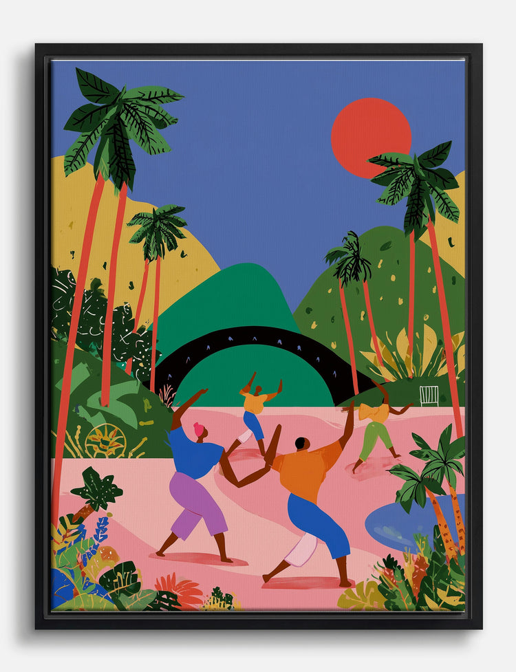Feel the energy of celebration leap off your walls with this vibrant scene. Lush palms, rolling green hills, and a fiery sun set the stage for a group of dancers, caught mid-spin in pure, infectious joy. This piece instantly enlivens any space, inviting movement and togetherness.