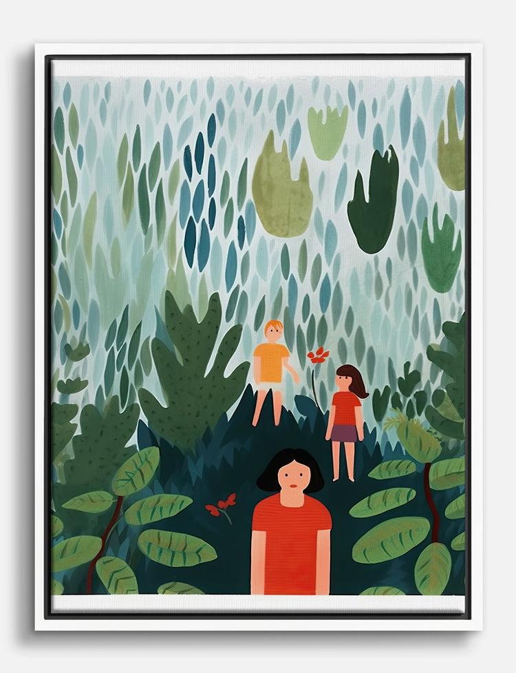 A lush jungle comes alive as three tiny figures wander among oversized leaves, sparking a sense of wonder and playful adventure. This vibrant piece brings a fresh pop of green and red to your walls, making any room feel more energetic and alive. Style it in your living room or kids room for a daily reminder that even the smallest moments can be magical. The bold, graphic colors blend effortlessly with modern or eclectic decor, adding a dash of personality you’ll be proud to show off.