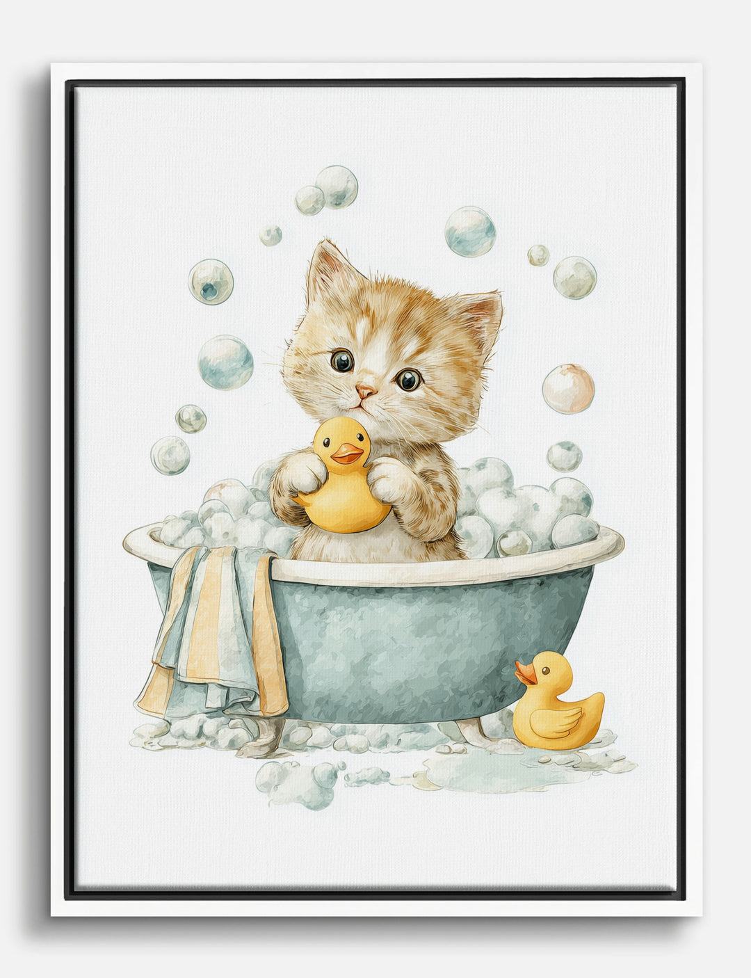 Ready for a daily dose of pure joy? A wide-eyed kitten, wrapped in bubbles and clutching a rubber duck, instantly brings a playful spirit to your space. Soft blue and creamy beige tones make this piece a natural fit for nurseries or kids rooms, but it’s equally charming in a bathroom for a touch of whimsy.