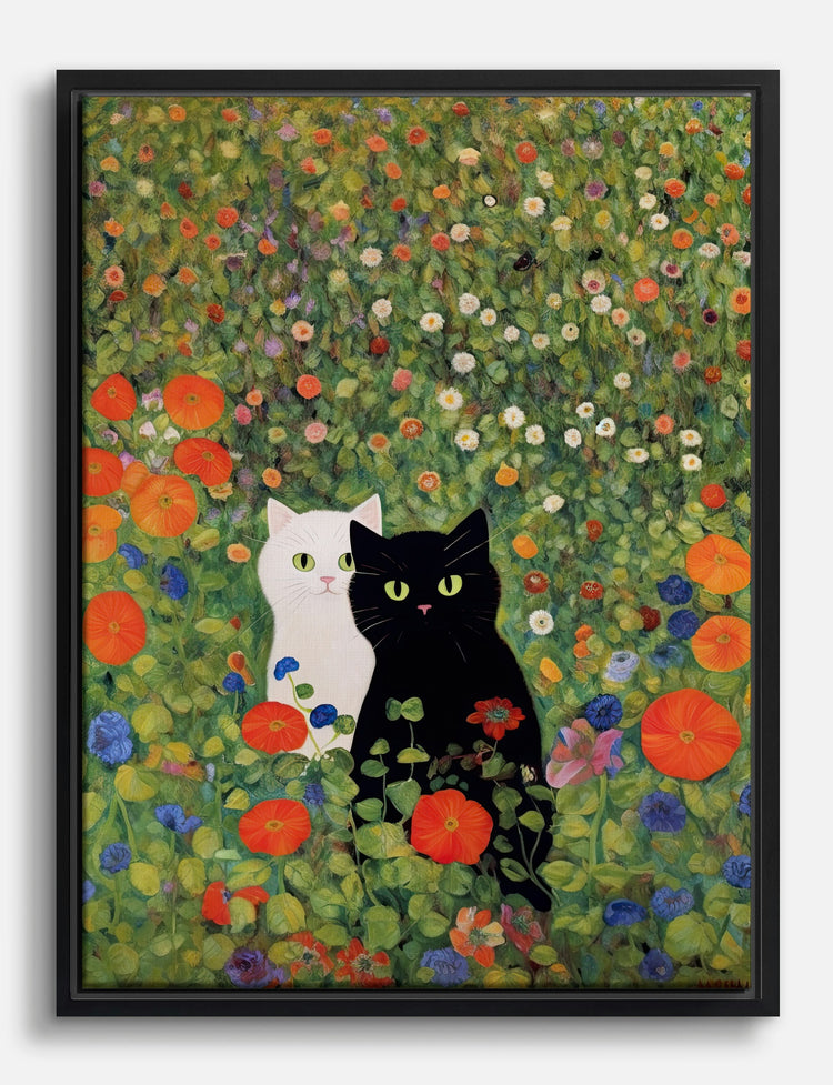 Two cats, one midnight black and one pure white, sit side by side in a riot of wildflowers—ready to bring a pop of personality to your favorite room. This piece channels the whimsical magic of Klimt, blending vibrant florals with the quiet companionship of feline friends.