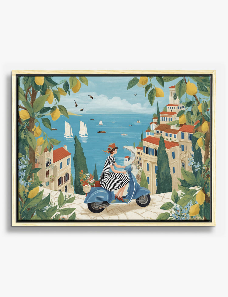 What if every day could feel like a sun-drenched Italian holiday? This vibrant piece captures that spirit, whisking you away to the Amalfi Coast with every glance. Sunlit lemons frame a scene of pure joy: a woman in a breezy dress, zipping along a cliffside road on a vintage blue scooter, with the sparkling sea and terracotta rooftops stretching beyond. Hang it in your living room or bedroom to instantly energize your space with Mediterranean charm and endless summer vibes. The uplifting palette of blues, yellows, and lush greens pops against both modern and traditional decor—making your walls feel fresh, lively, and effortlessly chic. Let this artwork be your daily reminder that adventure, style, and a little romance are always within reach—right at home.