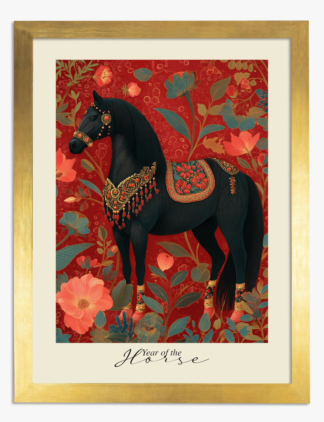 Feel the power and grace of the horse come alive in your space with this richly detailed piece. Deep reds and golds create an atmosphere thats both regal and inviting, while the dark, poised horse stands as a symbol of strength and vitality. Picture this artwork above your living room sofa or in a cozy bedroom nook—its lush floral background and ornate patterns instantly warm up any setting. The bold color palette pairs effortlessly with both classic and modern décor, giving your home a pop of personality and style. With every glance, youll be reminded of your unique taste and the joy of self-expression. Let your walls tell a story—one of beauty, tradition, and transformation—without ever feeling out of reach.