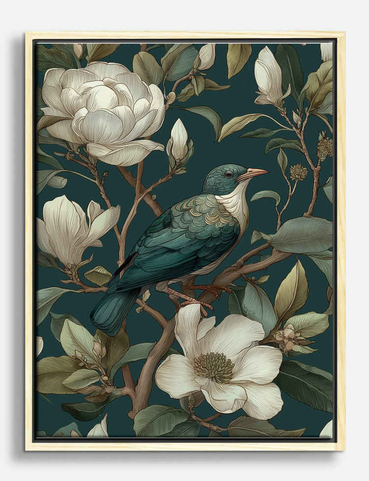 A single bird perched among lush magnolia blooms—this piece brings a quiet confidence to any room. The deep teal and cream palette feels both modern and timeless, letting your unique style shine through.