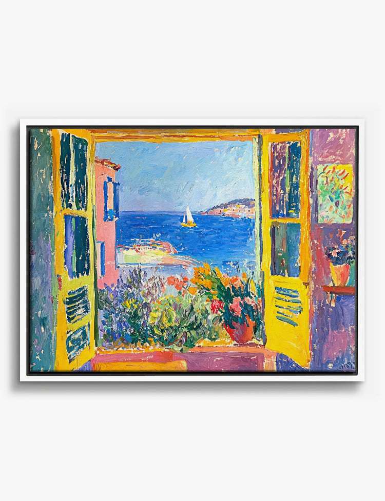 Sunlight spills into your space with a burst of color and charm in this Matisse-inspired window view. Looking out to a sparkling blue sea, a single sailboat drifts lazily by, framed by lush flowers and vibrant shutters. You’ll feel like you’ve opened up your own Mediterranean villa, no matter where you live. This piece pops in a living room or bedroom, bringing a joyful, getaway vibe to your everyday. The bold palette—think sunshine yellow, ocean blue, and garden-fresh greens—makes it easy to match with everything from eclectic to modern decor. It’s an instant mood-lifter, a daily reminder that your home is your happiest place.