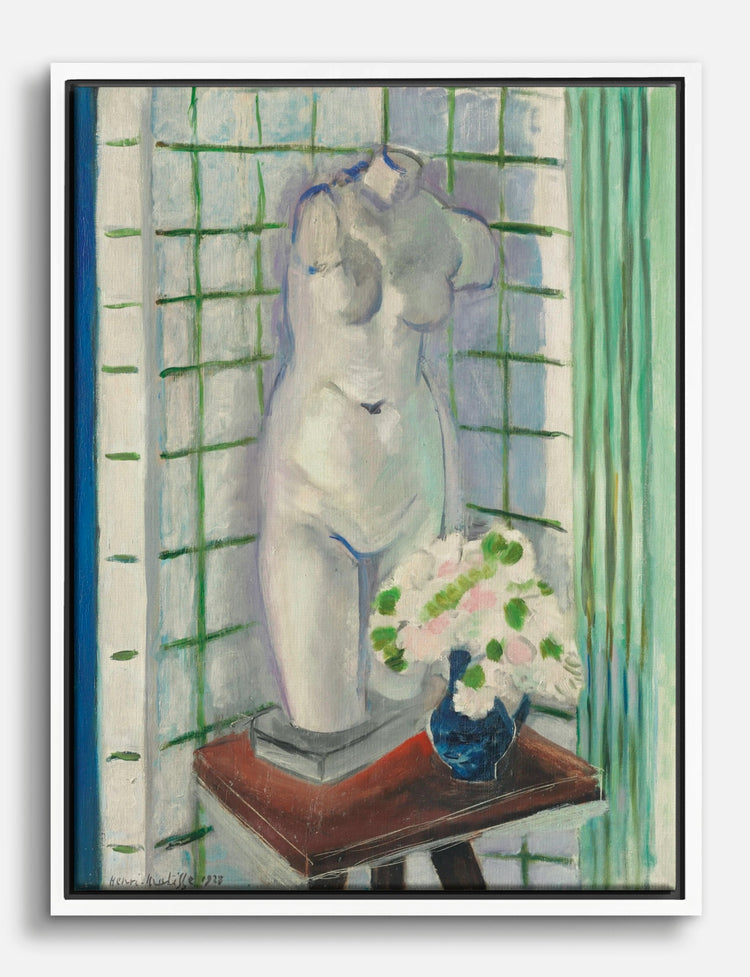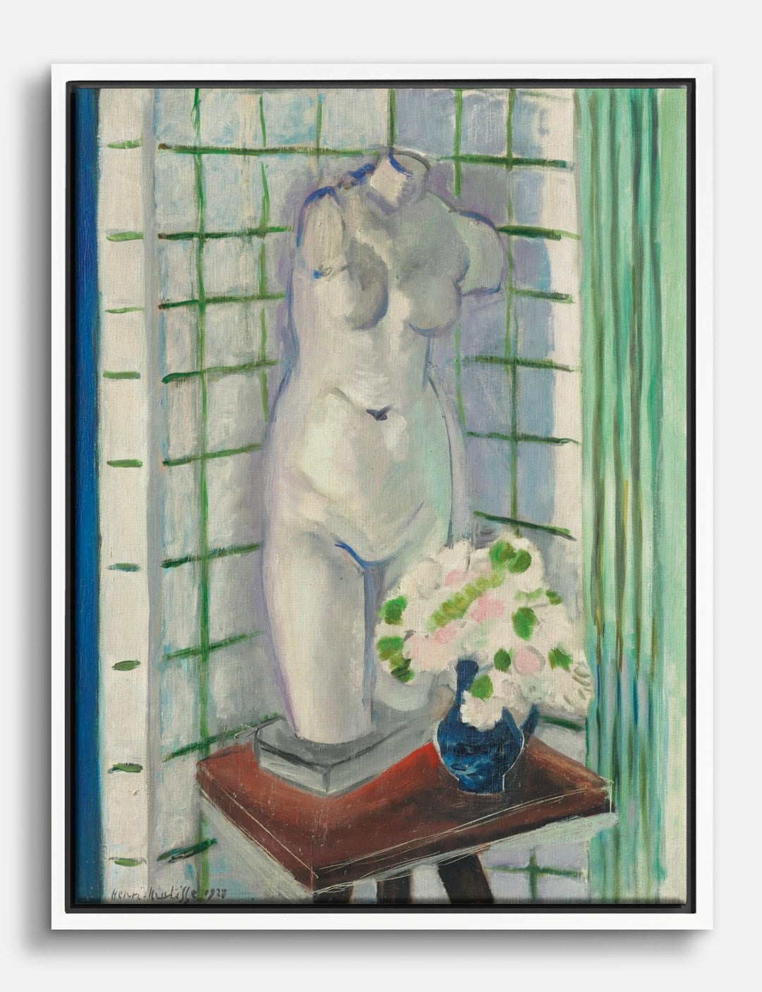 Bold yet tranquil, this piece invites you to pause and take in its quiet confidence. A soft plaster torso stands alongside a vase of fresh blooms, creating a vibe thats both artistic and effortlessly chic. Let it bring a touch of Parisian studio magic to your living room or bedroom—perfect for those who love a blend of classic sculpture and fresh floral energy. The gentle greens and whites play beautifully with modern or vintage decor, turning any space into your personal gallery.