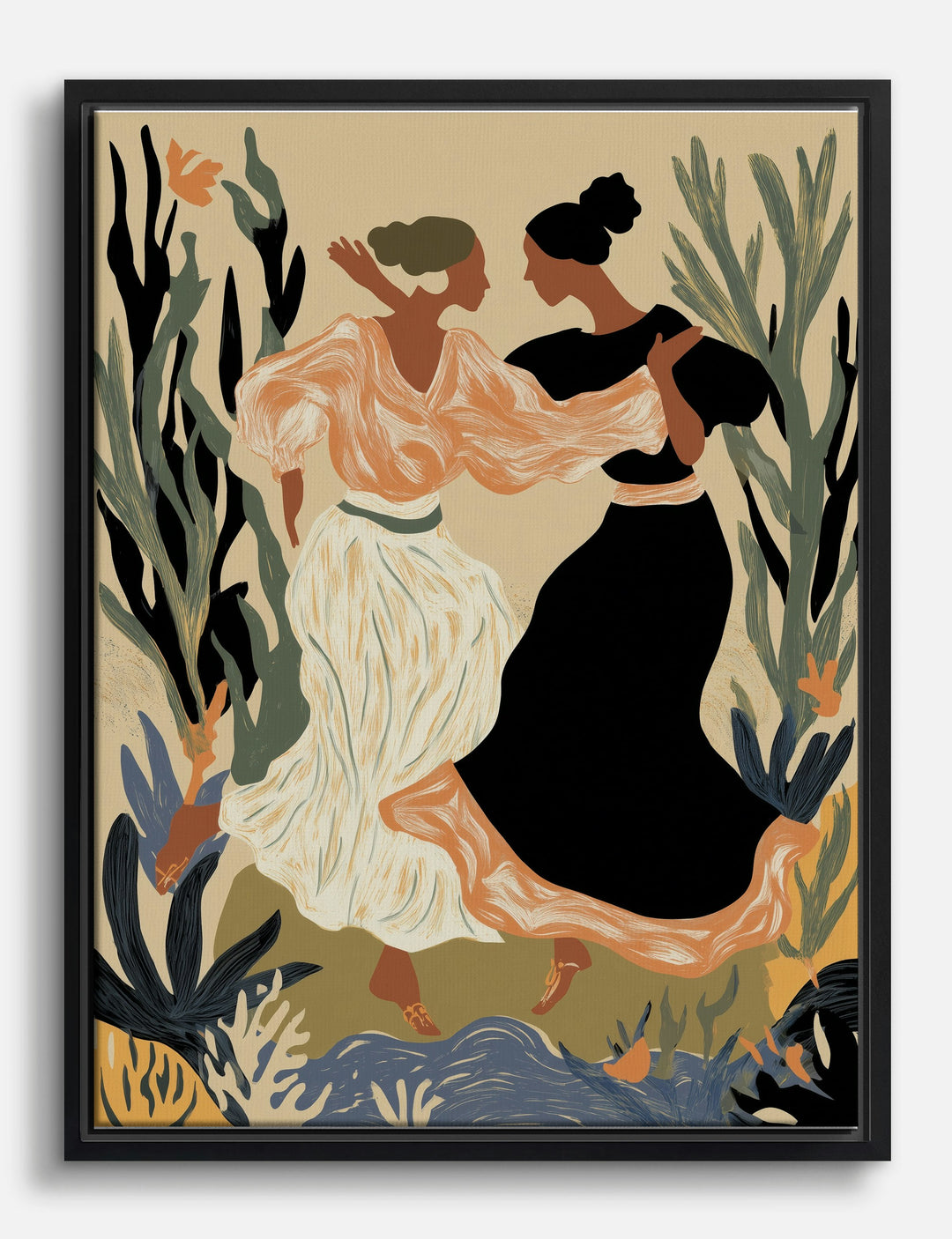 Two figures swirl in effortless harmony, their flowing skirts and graceful arms capturing the pulse of movement and connection. This piece brings a sense of freedom and joy to your space, inviting you to celebrate every day’s little moments.