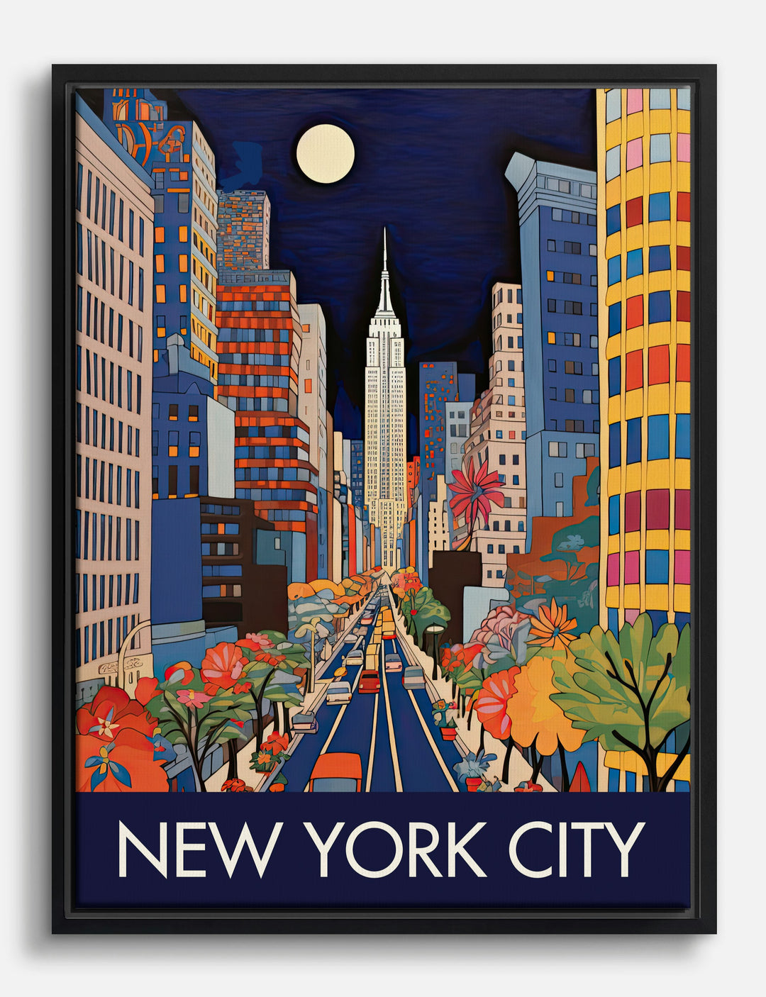 A city that never sleeps, captured in bold color and energy. This vibrant New York City scene brings the pulse of Manhattan right into your space, with lively lines and a moonlit sky that feels both electric and inviting.