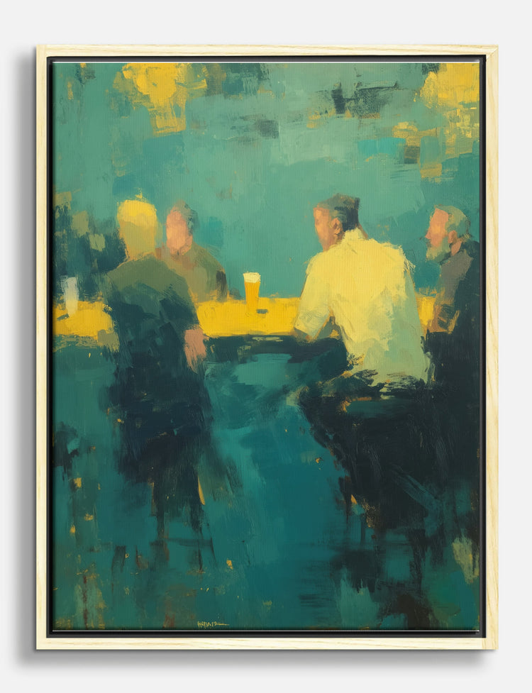 A golden glow cuts through cool teal shadows, capturing the buzz of a night spent in good company. This piece instantly brings a sense of connection and laid-back charm to your favorite gathering spot.