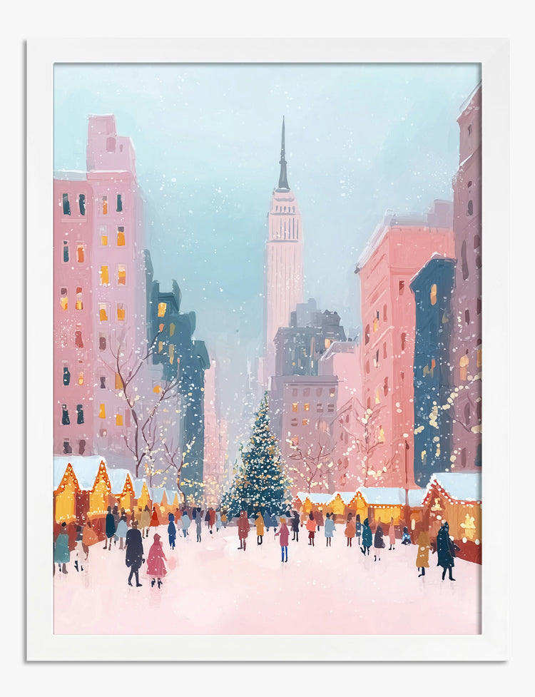 Snow drifts past rosy skyscrapers while market lights glow—welcome to a New York winter stroll. This piece captures the hush of fresh snow and the buzz of city cheer, inviting that cozy, twinkly feeling into your home.