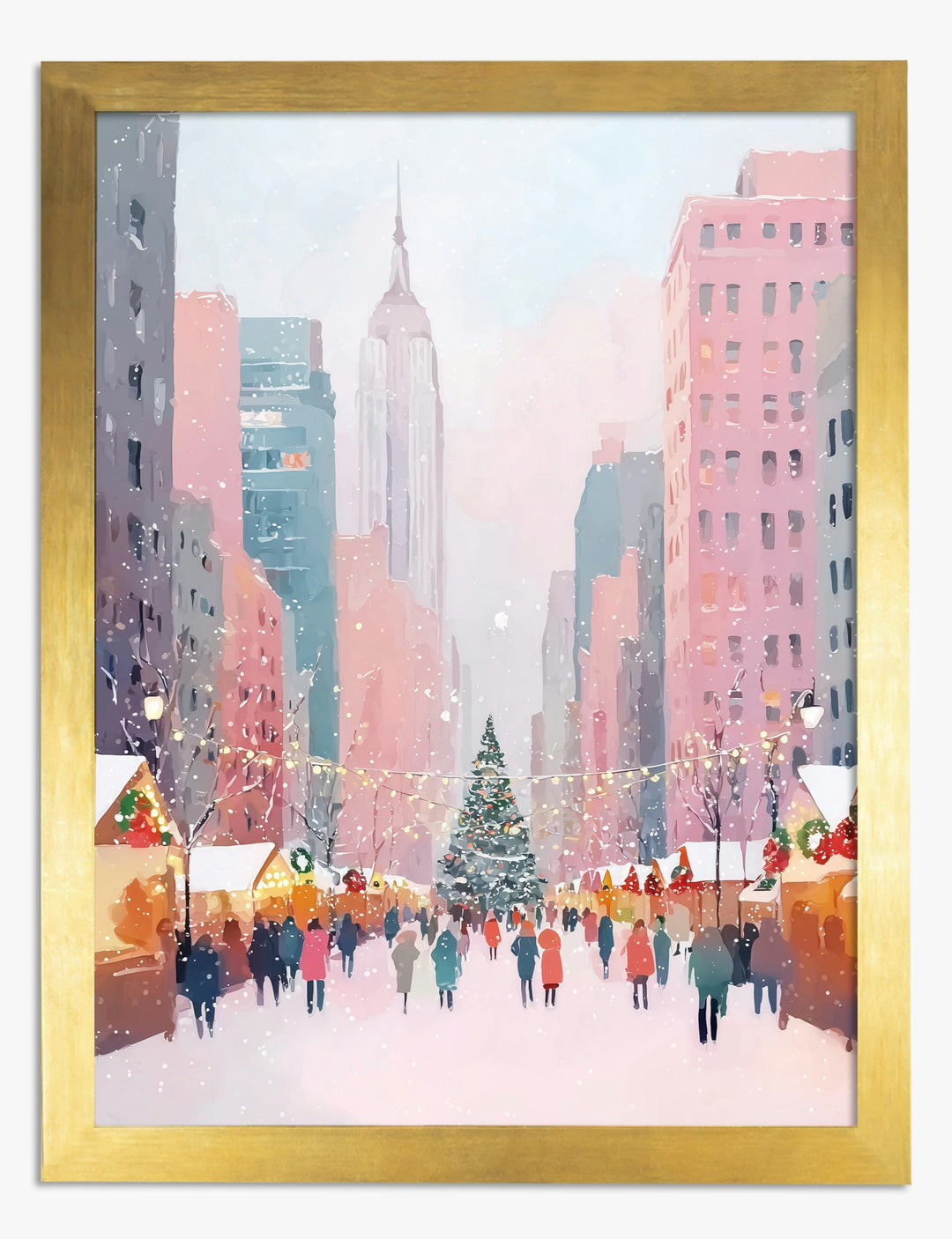 Like the first snow in the city, this piece drifts charm into your space. Pastel towers glow in blush and teal as string lights lead toward a sparkling tree and a cheerful winter crowd.