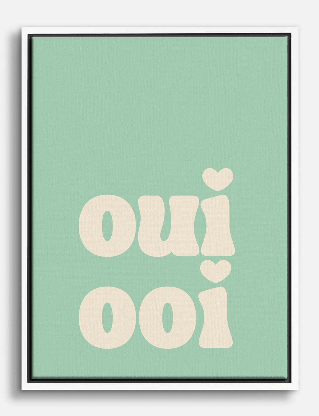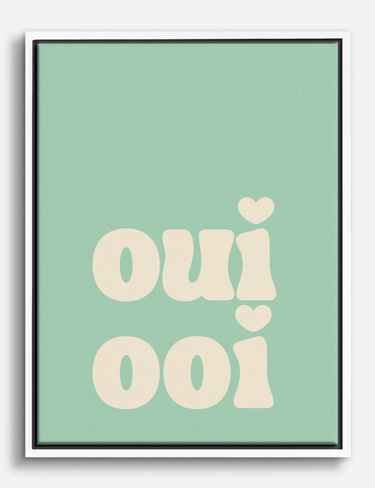 Playful curves and soft mint green—this piece is like a wink from your wall, inviting positivity and lightness into any room. The bold “oui oui” typography, topped with charming heart accents, instantly adds a pop of joy and retro flair to your space.