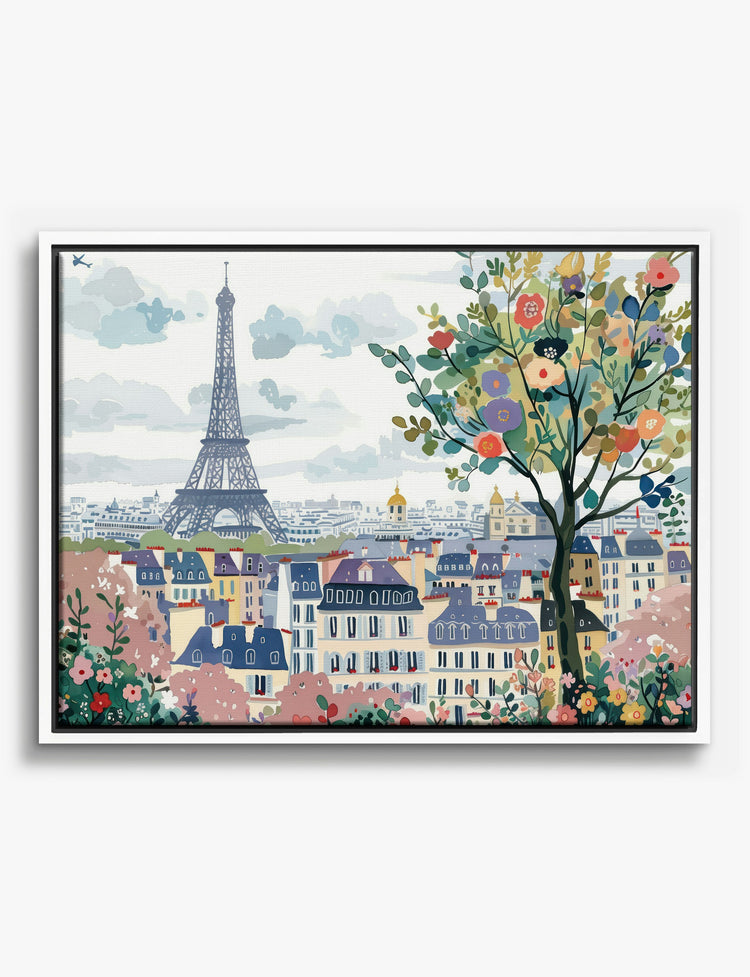 A city of romance, reimagined in watercolor. Lush florals frame iconic Parisian rooftops, while the Eiffel Tower rises gracefully in the distance. This piece instantly brings the charm of Paris into your home—no passport required. Let it add a soft, uplifting vibe to your living room or bedroom. The gentle blues, greens, and pops of pastel florals play beautifully with both classic and modern decor. Youll love how it brightens your space and sparks a sense of wanderlust every time you walk by. Give your walls a fresh story to tell—one that feels uniquely yours and effortlessly chic.