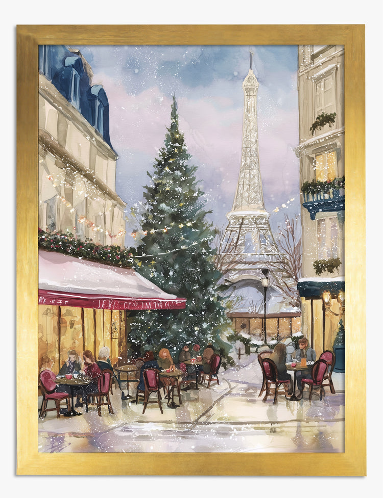 Let your walls capture the sparkle of a Paris winter—where twinkling lights, cozy cafés, and the iconic Eiffel Tower set the scene for a season of joy. This artwork instantly transports you to a festive Parisian street, where laughter drifts from outdoor tables and a grand Christmas tree glows at the center of it all.